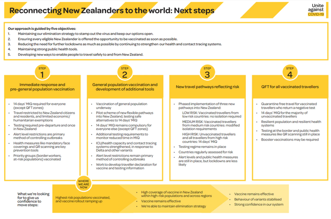 The New Zealand government has announced our 4 stage road map to reconnect New Zealanders to the world and allow us to welcome back international travellers starting in early 2022.